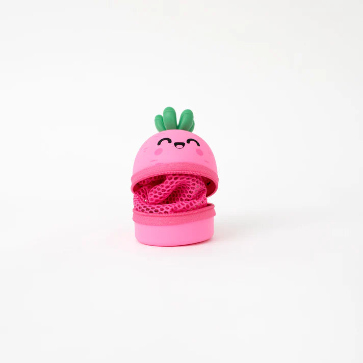 Estojo em formato de beterraba da Mr. Wonderful, feito de silicone e rede. Possui um fecho de zíper que permite que as partes superior e inferior do estojo se encaixem, criando um divertido formato da personagem. A parte do meio, que caberia dentro da personagem quando fechada, é feita de malha de poliéster, permitindo que seja usada como estojo, deixando seu conteúdo visível.