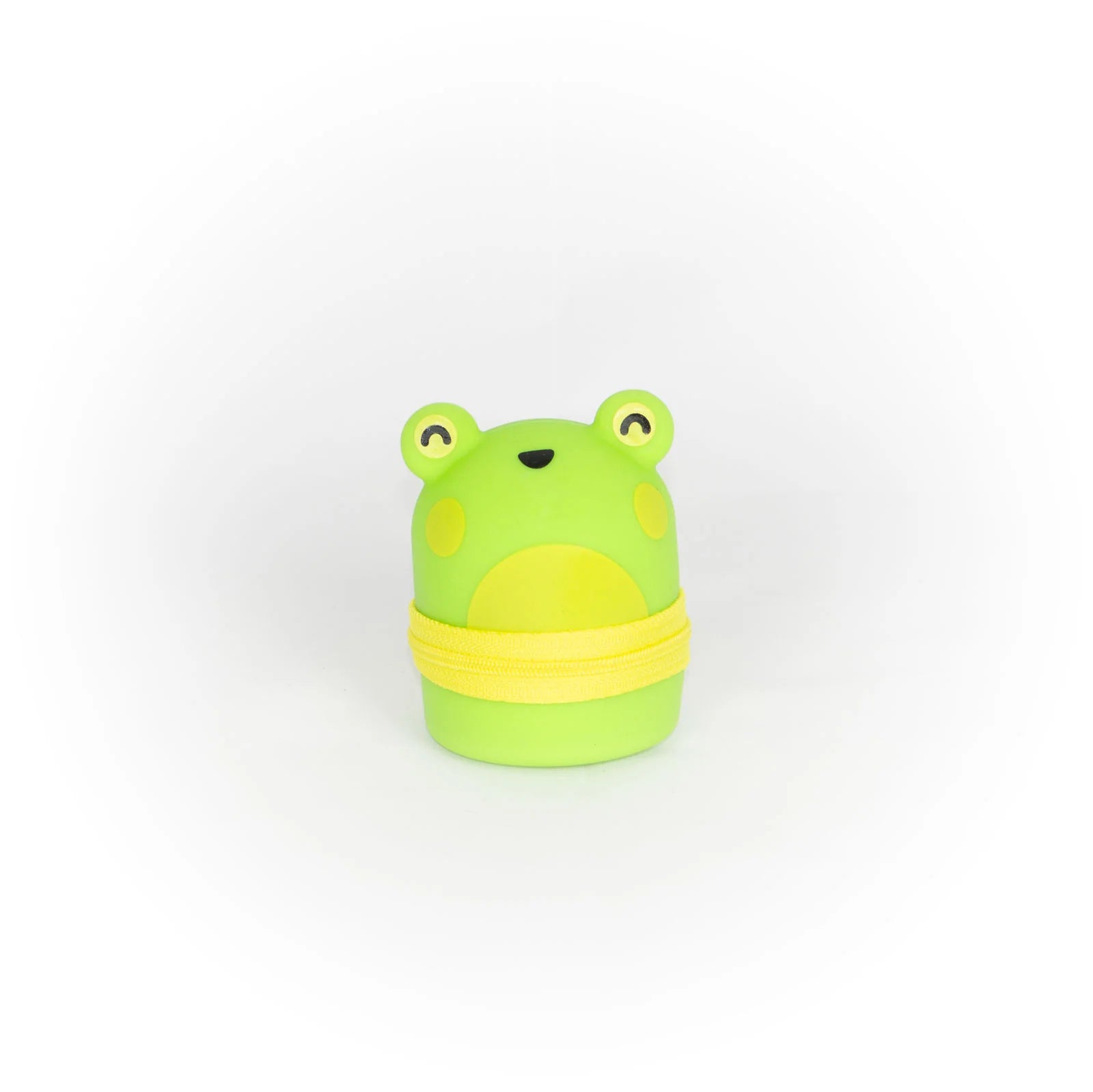 Estojo em formato de sapo da Mr. Wonderful, feito de silicone e rede. Possui um fecho de zíper que permite que as partes superior e inferior do estojo se encaixem, criando um divertido formato da personagem. A parte do meio, que caberia dentro da personagem quando fechada, é feita de malha de poliéster, permitindo que seja usada como estojo, deixando seu conteúdo visível.