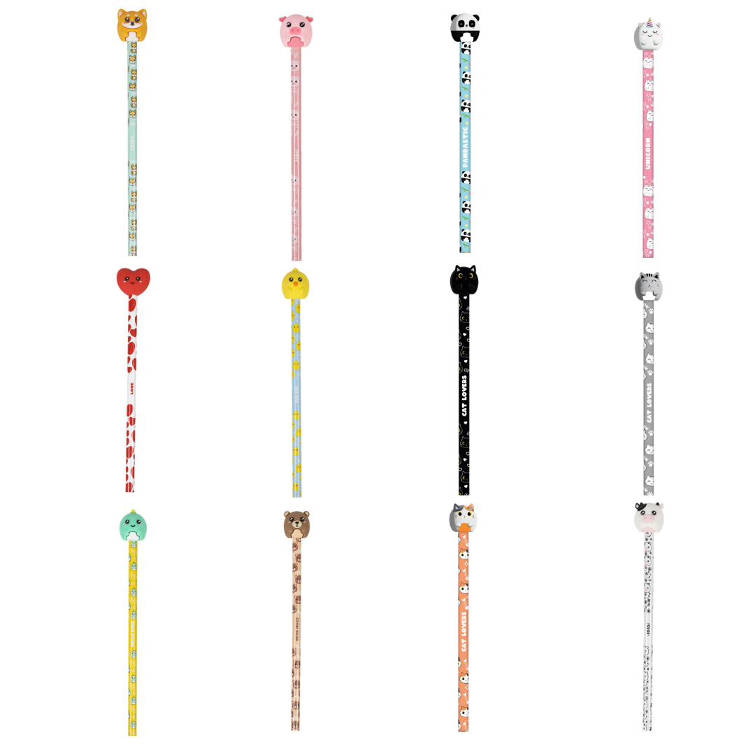 Design irresistível para crianças – cada lápis apresenta um personagem animal adorável no topo (gato, panda, unicórnio…), tornando o uso diário num momento lúdico e inspirador.
