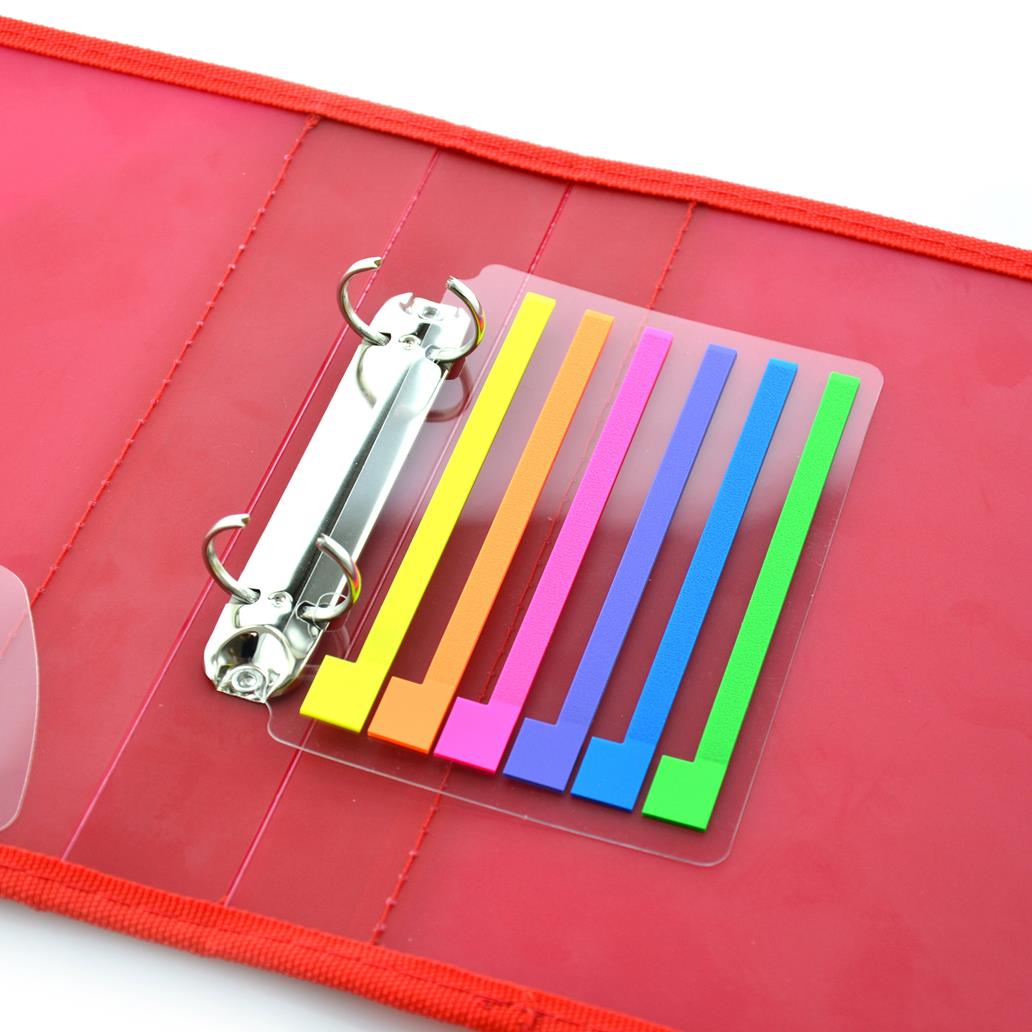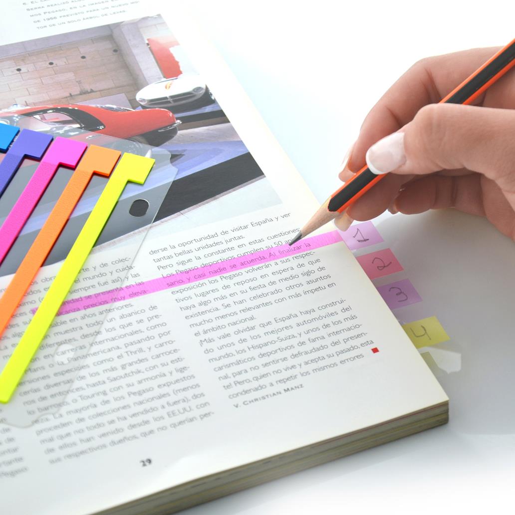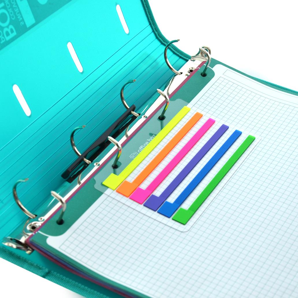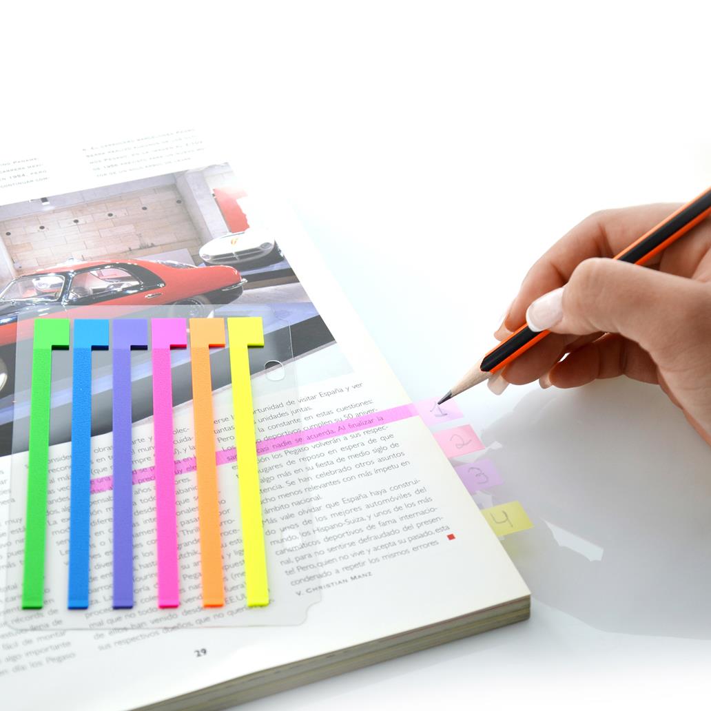 Cada tira possui um marcador de índice integrado e um verso transparente, ideal para usar em cadernos, dossiers e sistemas de argolas.